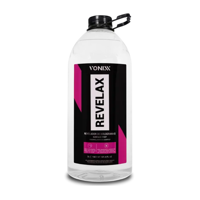 REVELAX evidencia defeitos da pintura, como hologramas e swirls mascarados por ceras, selantes e polidores. É também recomendado para limpeza de vidros e descontaminação de plásticos, principalmente antes da aplicação de V-Plastic, removendo produtos como silicones e contaminações diversas. Seu uso deixa a peça pronta para inspeção antes de qualquer trabalho.